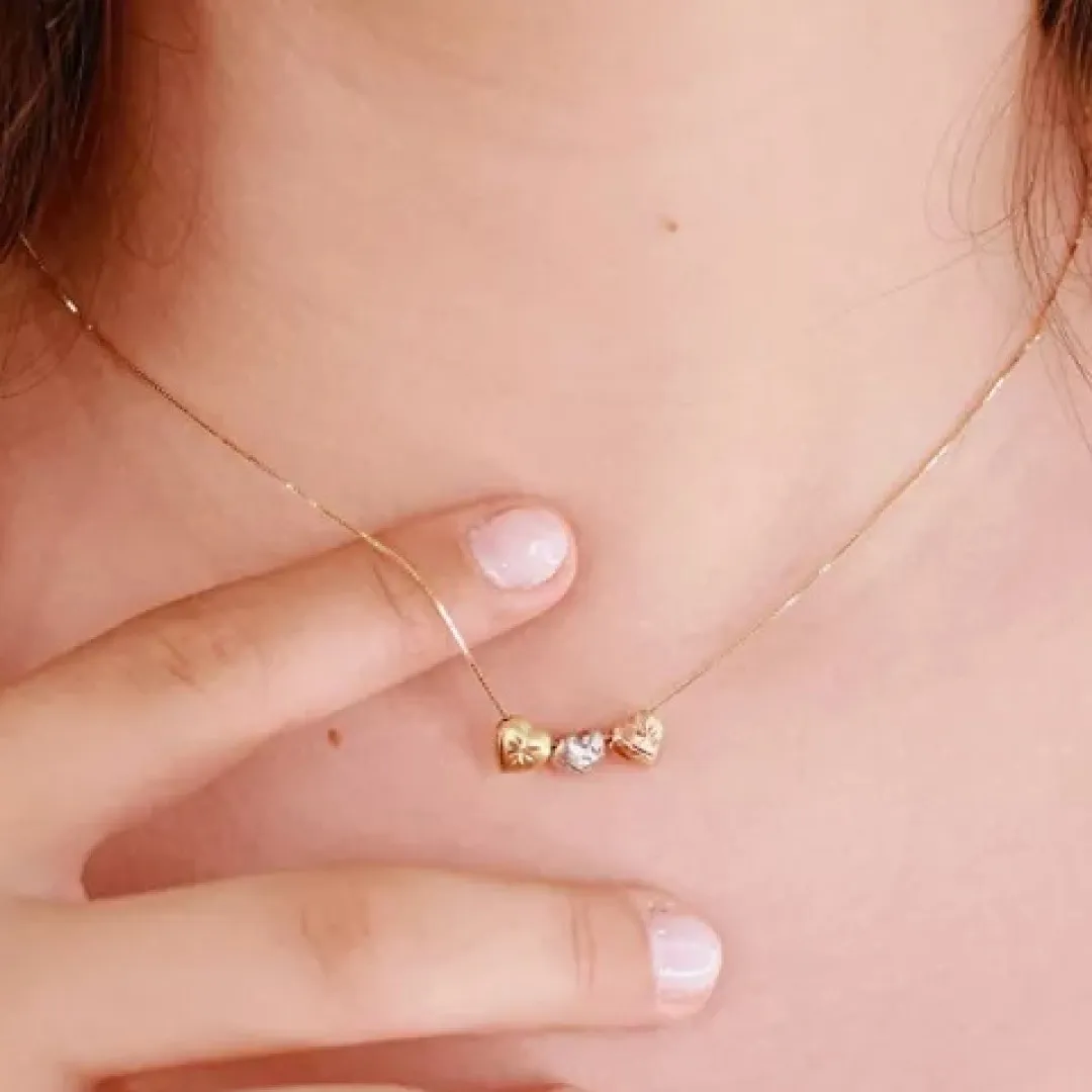 - 1 (um) Cordão Veneziana de Ouro 18k com três pingentes de coração tricolores (amarelo, branco e rosa).